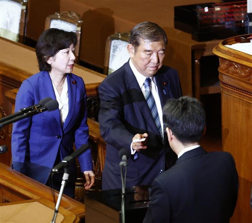 | Le chef du Parti libéral-démocrate du Japon, Shigeru Ishiba (centre), a été réélu Premier ministre. |