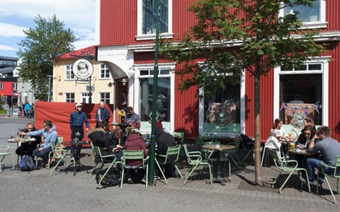 | Des touristes assis à la terrasse d'un café à Reykjavik, le 1er juillet 2016. |