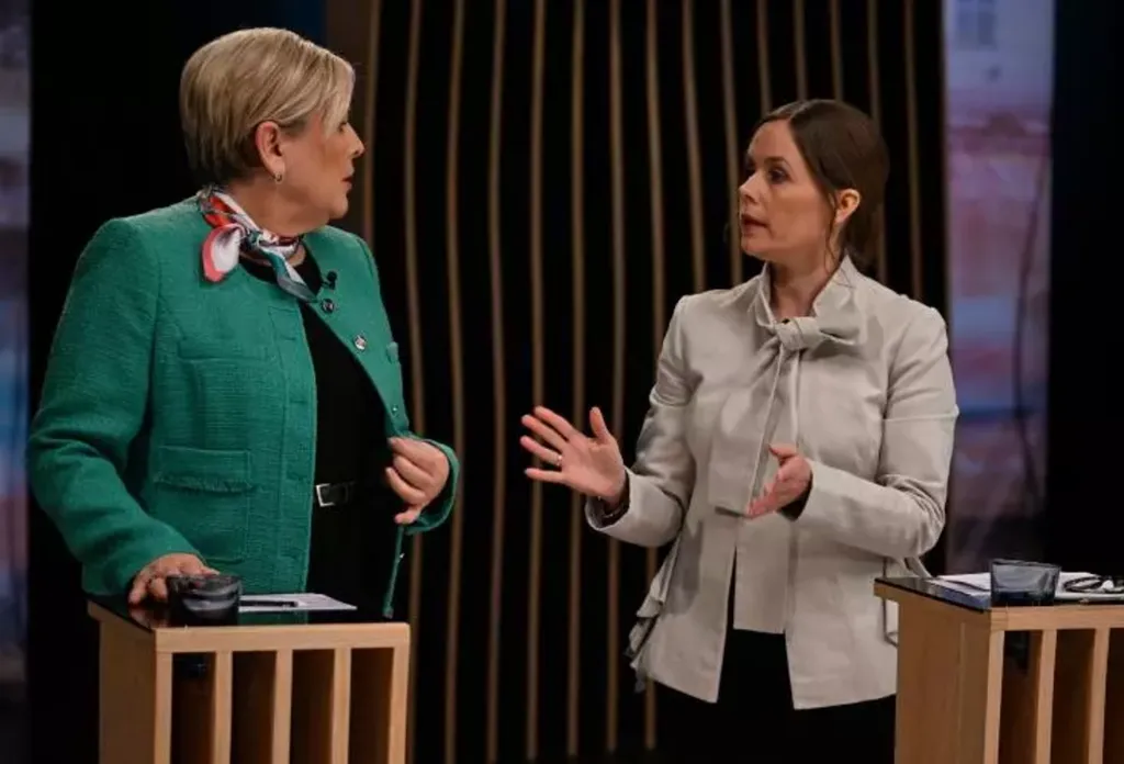 | Les candidates à la présidentielle en Islande, Katrin Jakobsdottir (droite) et Halla Tomasdottir, pendant un débat électoral à Reykjavik, le 31 mai 2024. |