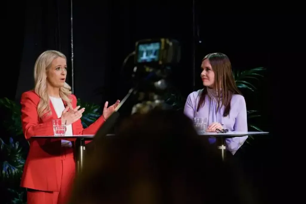 | Les candidates à la présidentielle Katrin Jakobsdottir (droite) et Halla Hrund Logadottir pendant un débat télévisé à Reykjavik, le 28 mai 2024. |