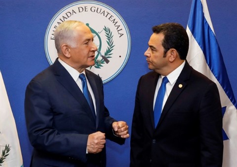 | Le Premier ministre israélien Benjamin Netanyahu (gauche) et le président du Guatemala Jimmy Morales avant l'inauguration de l'ambassade du Guatemala, le 16 mai à Jérusalem. |