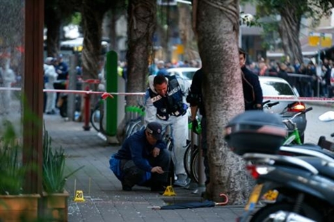 | Des experts de la police israélienne sur les lieux d'une fusillade qui a fait deux victimes dans le centre de Tel Aviv, le 1er janvier 2016. |