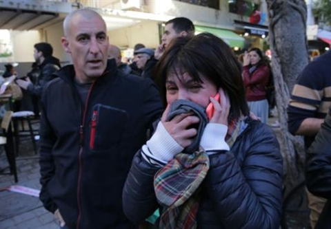 | Une femme réagit après avoir été témoin d'une fusillade dans le centre de Tel Aviv, le 1er janvier 2016. |