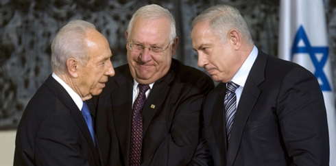 | Le président Shimon Peres (gauche), le Premier ministre Benjamin Netanyahu (droite)et Reuven Rivlin, actuel favori à la présidentielle. |