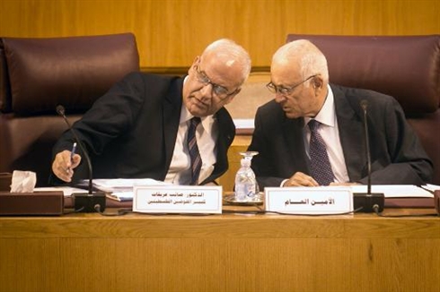 | Saeb Erekat (gauche), chef de la délégation palestinienne, discute avec Nabil al-Arabi, secrétaire général de la Ligue arabe, le 11 août au Caire |
