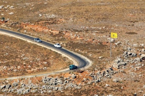| Image prise depuis la ville israélienne de Metula, montrant un drapeau du Hezbollah dans le Sud du Liban, le 14 juillet. |