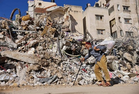 | Un Palestinien passe devant les décombres d’un immeuble complètement détruit par les bombardements israéliens à Gaza City, le 19 mai. |
