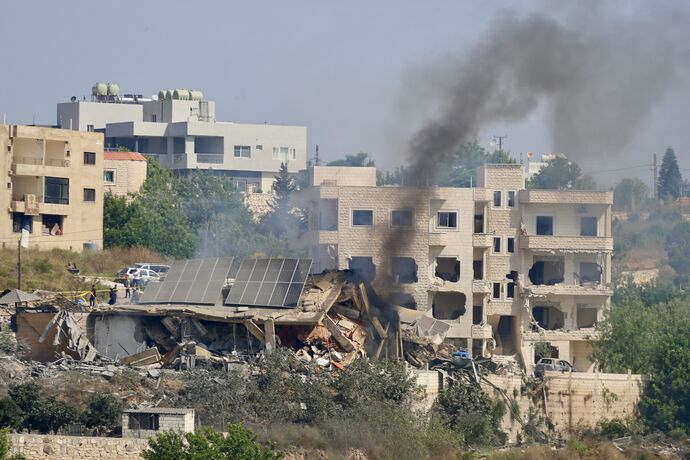 | Des fumées au dessous du ciel de Tayr Harfa, au Liban, après les frappes d'Israël. |