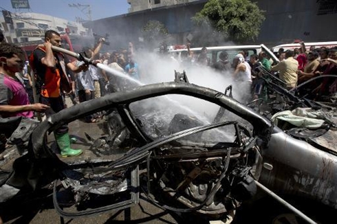 | Des pompiers éteignent le feu qui a pris dans un véhicule après une frappe aérienne israélienne sur la bande de Gaza le 8 juillet. Photo : AFP/VNA/CVN |
