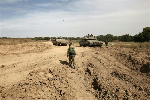 | Des soldats israéliens postés le long de la frontière avec Gaza, près du kibboutz de Nahal Oz, le 4 mai. |