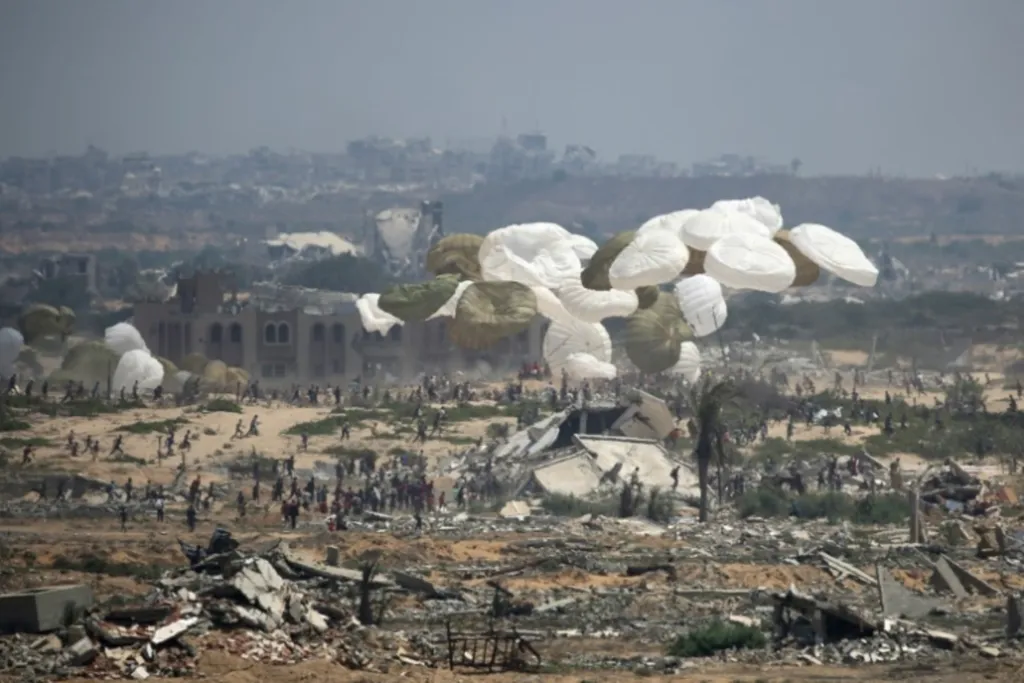 | Des palettes d'aide humanitaire sont larguées par un avion militaire au-dessus de Nousseirat. |