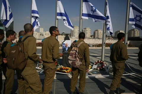| Des soldats israéliens se recueillent devant le cercueil de Shimon Peres, à Jérusalem le 29 novembre. |