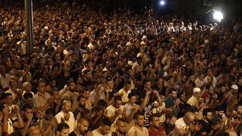 | Des Palestiniens musulmans prient aux abords de l'esplanade des mosquées, le 23 juillet, en protestation contre les nouvelles mesures sécuritaires israéliennes. |