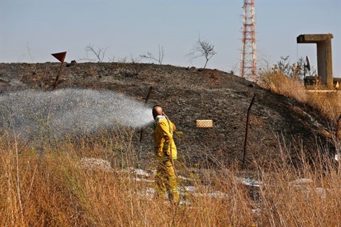 | Un pompier israélien éteint un incendie qui s'est déclaré dans des champs de la ville de Kiryat Shmona, dans le Nord, à la suite de tirs de roquettes depuis le Liban, le 4 août. |