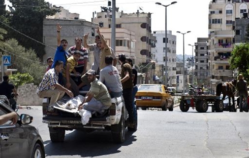 | Des Palestiniens, qui escortent les corps de deux enfants tués dans un raid aérien israélien à Gaza, le 21 août |