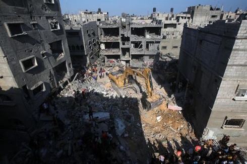 | Des secouristes palestiniens creusent dans les gravats d'un immeuble détruit par des bombardements israéliens à Rafah dans le Sud de la bande de Gaza, le 21 août |
