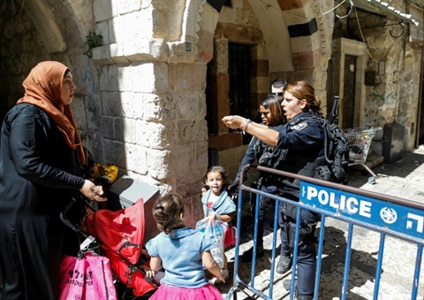 | Des membres de la police israélienne empêchent l'accès à l'esplanade des Mosquées, le 27 juillet. |
