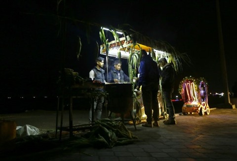 | Des vendeurs de rue palestiniens s'éclairent grâce à des batteries au cours d'une coupure de courant dans la bande de Gaza, le 27 avril. |