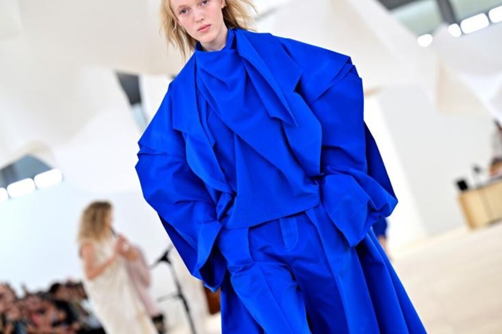 Les gigantesques chapeaux des looks monochromes bougent comme le décor en papier plissé apportant au défilé une dimension onirique.