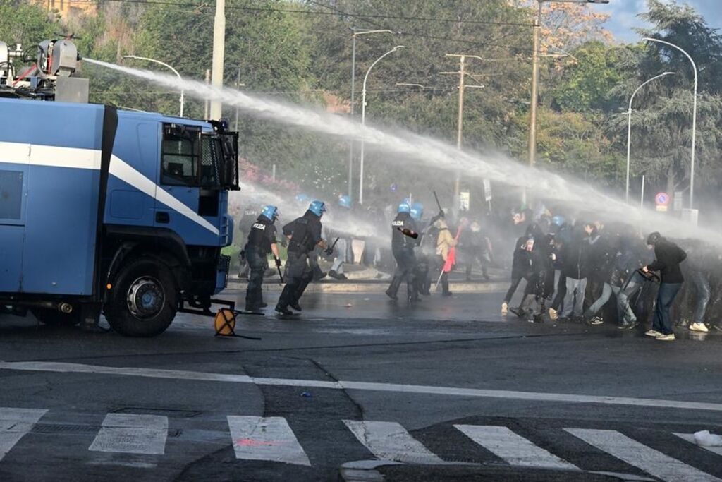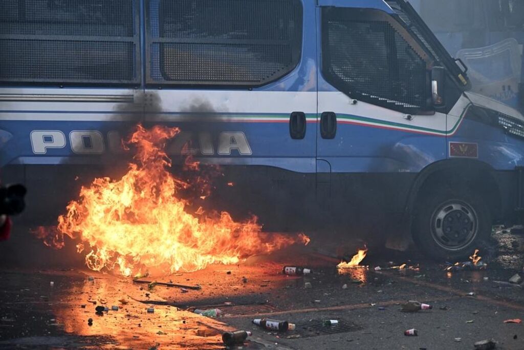 | Des flammes pendant un affrontement entre certains manifestants et des policiers lors d'une manifestation pro-palestinienne à Rome, en Italie, le 5 octobre 2024. |