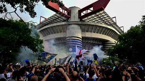| Des supporters de l'Inter Milan fêtent le titre de champion d'Italie après le match de Serie A contre l'Udinese, à San Siro, le 23 mai. |