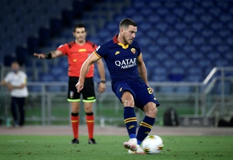 | Le Français de l'AS Rome, Jordan Veretout, marque sur penalty contre Hellas Vérone, le 15 juillet à Rome. |
