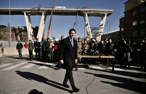 | Le Premier ministre italien Giuseppe Conte à Gênes sur le site du pont effondré le 8 février. |
