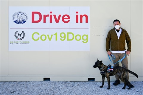 | Un instructeur et son chien renifleur entraîné pour détecter le COVID-19 à travers la transpiration au Campus Bio-Medico, un hôpital universitaire dans la banlieue de Rome. |