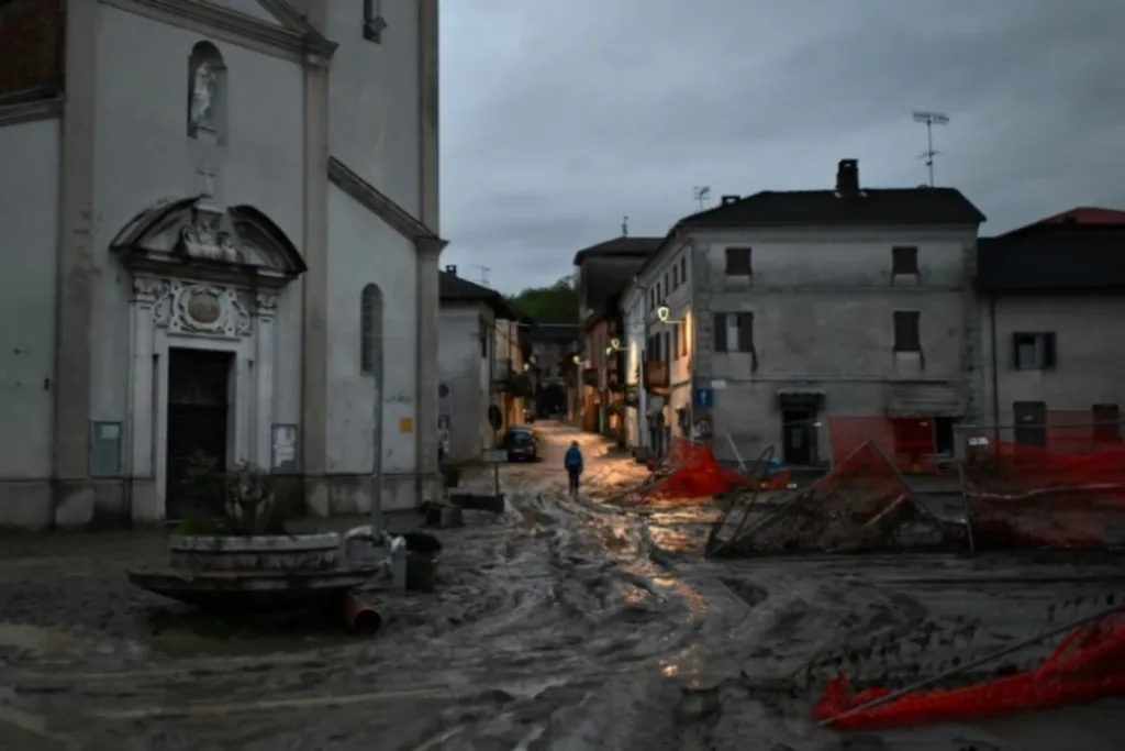 Des images de l'AFP montrent des rues envahies par la boue à Monteu da Po, dans le Piémont, la petite localité où les pompiers ont trouvé jeudi 17 avril le nonagénaire décédé.