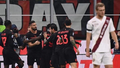 | L'attaquant français de l'AC Milan, Olivier Giroud (2e, gauche), est félicité par ses coéquipiers, après avoir ouvert le score contre le Torino, lors de leur match de Serie A, le 26 octobre au Stade San Siro. |