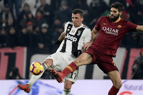 | L'attaquant croate de la Juventus, Mario Mandzukic (gauche), à la lutte avec le défenseur argentin de la Roma, Federic. |