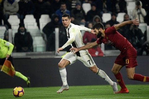 | L'attaquant de la Juventus, Cristiano Ronaldo, face au défenseur de la Roma, Federico Fazio, le 22 décembre à Turin. |