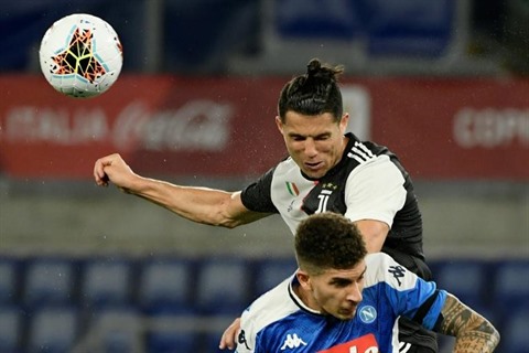 | La star de la Juventus Cristiano Ronaldo (en noir et blanc) lutte pour le ballon avec le joueur de Naples Giovanni Di Lorenzo, le 17 juin au Stade olympique de Rome. |