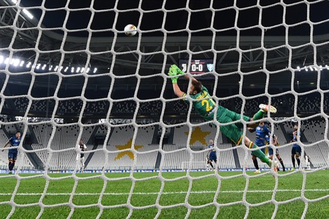 | Le gardien de Lecce, Gabriel, encaisse le premier but de la Juventus, une frappe en lucarne de l'attaquant argentin Dybala, lors du match de Serie A à Turin, le 26 juin. |