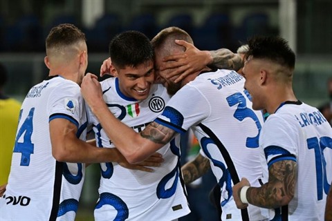 | La joie de l'attaquant argentin de l'Inter Milan, Joaquin Correa, félicité par ses coéquipiers, après avoir marqué le 2e but face à Hellas Vérone, lors de leur match de Serie A, le 27 août à Vérone. |