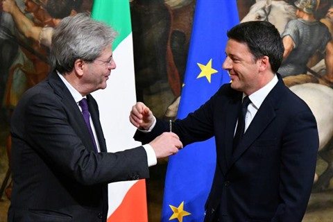 | Le nouveau Premier ministre italien Paolo Gentiloni (gauche) et son prédécesseur Matteo Renzi, le 12 décembre |