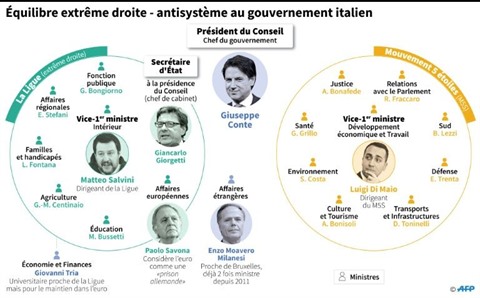 Le M5S, désormais premier parti d'Italie avec 32% des voix obtenus aux élections législatives du 4 mars, est parvenu à constituer le premier gouvernement populiste dans un pays fondateur de l'Union européenne, aux côtés de la Ligue.