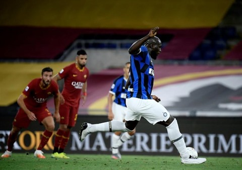 | L'attaquant belge de l'Inter Milan, Romelu Lukaku, marque un penalty sur le terrain de la Roma, le 19 juillet au Stade Olympique de Rome. |