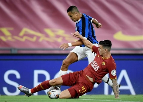 | L'attaquant chilien de l'Inter Alexis Sanchez taclé par le défenseur brésilien de la Roma Roger Ibanez, le 19 juillet au Stade Olympique de Rome. |