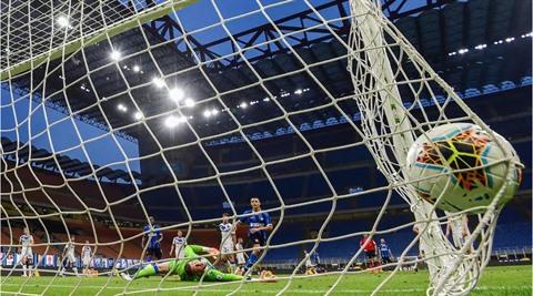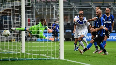 | Le gardien finlandais de Brescia, Jesse Joronen, impuissant devant l'ailier Antonio Candreva, qui marque le 6e but de l'Inter Milan, lors du match de Serie A, à Milan, le 1er juillet. |