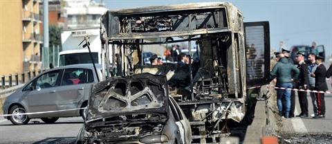 | L'épave d'un bus de transport scolaire incendié par son chauffeur, le 20 mars à San Donato Milanese, en Itali. |
