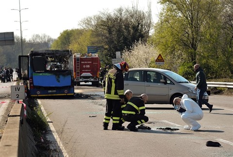 | La police scientifique italienne et des pompiers près de l'épave d'un bus de transport scolaire incendié par son chauffeur, le 20 mars à San Donato Milanese, près de Milan. |
