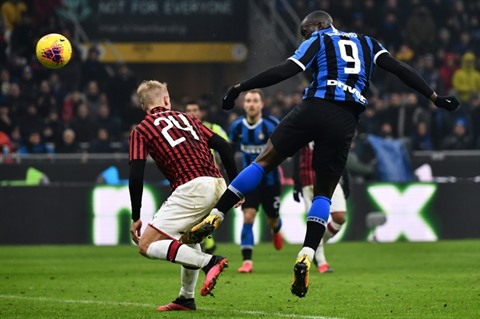 | L'attaquant belge de l'Inter Romelu Lukaku (droite) marque le 4e but de son équipe de la tête contre l'AC Milan, le 9 février à Milan. |