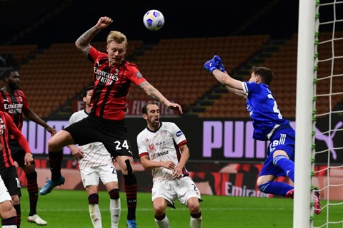 | Le gardien de Cagliari, Alessio Cragno, dévie le tir du défenseur danois de l'AC Milan, Simon Kjaer (gauche), lors du match de Serie A à Milan, le 16 mai. |