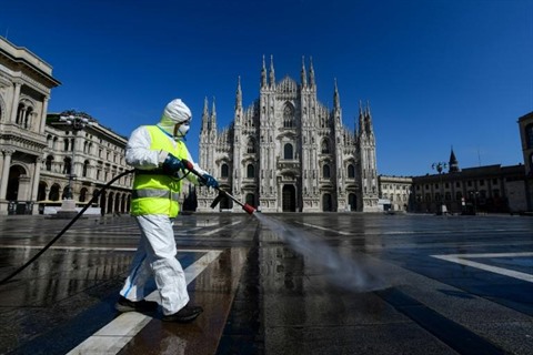 | Désinfection de la place Duomo à Milan, le 31 mars. |