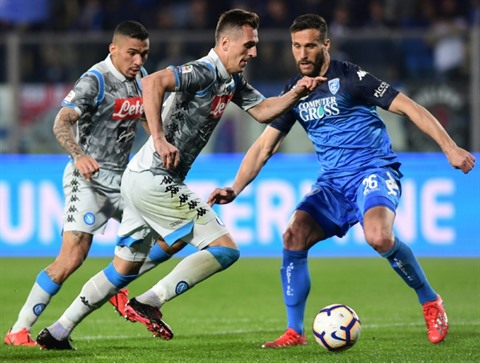| L'attaquant polonais de Naples, Arkadiusz Milik (centre), face au défenseur argentin d'Empoli, Matias Silvestre, le 3 avril en Italie. |