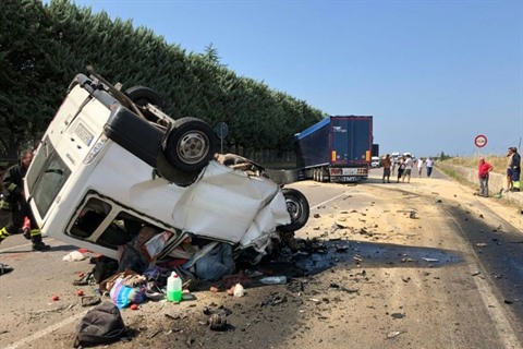 | Une collision entre une fourgonnette et un camion a fait 12 morts, tous des ouvriers agricoles étrangers, le 6 août dans le Sud de l'Italie. |