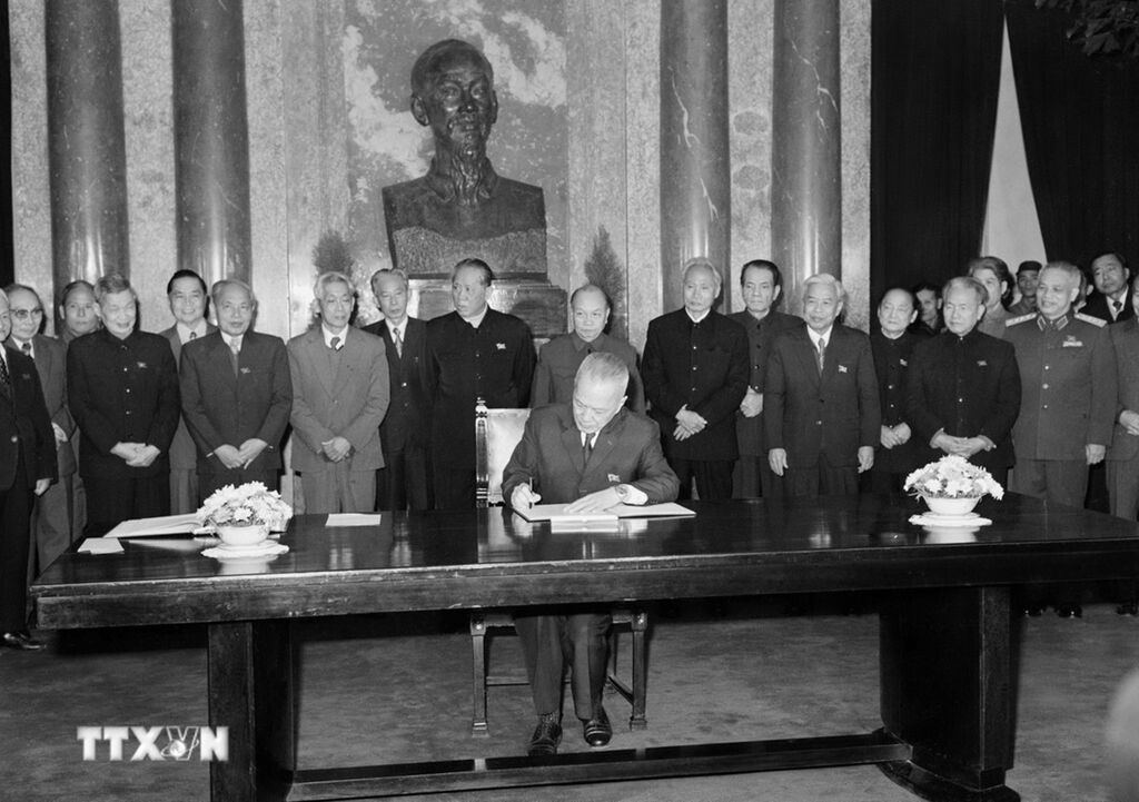| Le président par intérim de la République socialiste du Vietnam, Nguyên Huu Tho, a signé le décret promulguant la nouvelle constitution (décembre 1980). |