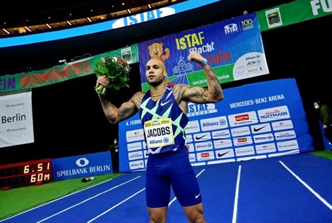 | Le sprinteur italien Lamont Marcell Jacobs vainqueur de la finale du 60 m indoor à Berlin, le 4 février. |