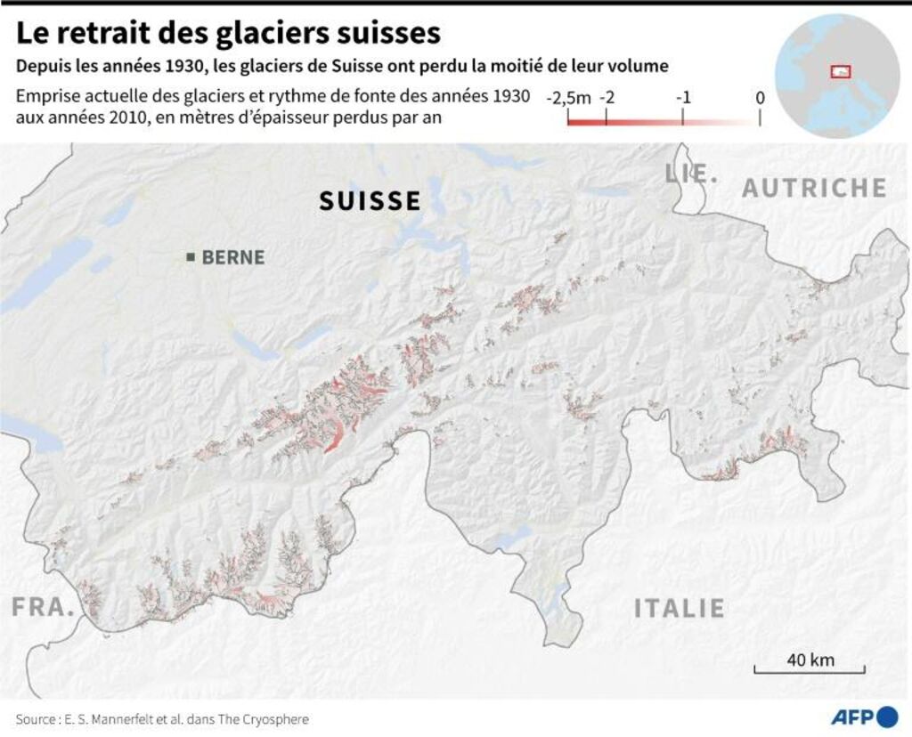 Trois kilomètres cubes de glace ont été perdus, soit 6% du volume total des glaciers suisses. Une perte de 2% en une année était jusque-là considérée comme "extrême" note la Commission d'experts réseau de mesures cryosphère de l’Académie suisse des sciences naturelles. Et cela va aller en s'empirant.